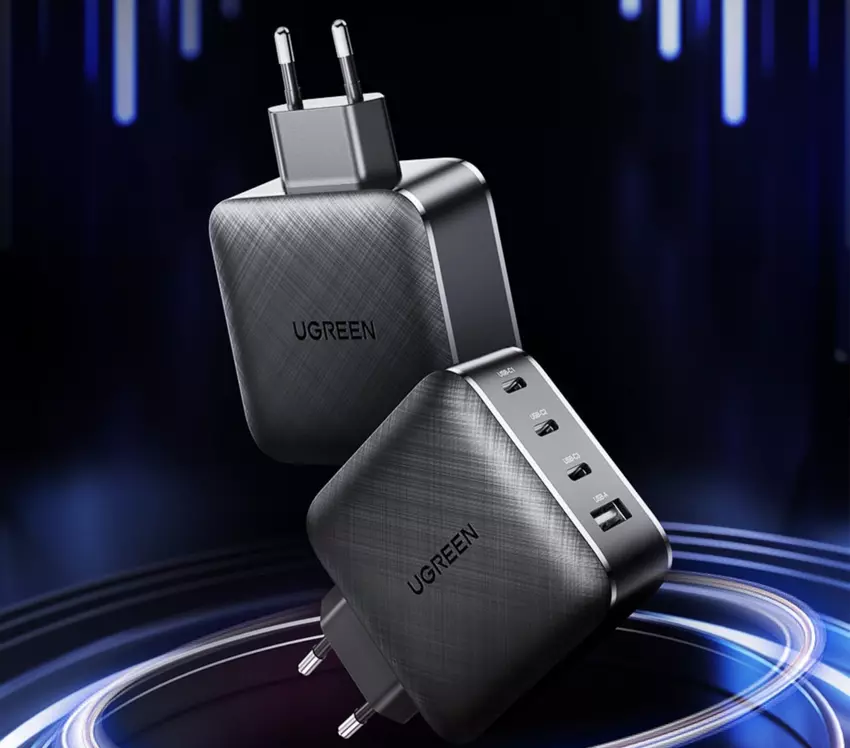 Die Rede ist vom 65-Watt-GaN-Laden. Es hat ein schwarzes Farbschema, einen europäischen Stecker und vier Anschlüsse: drei USB-C und einen USB-A. Das Gerät unterstützt Quick Charge 4.0-Technologien, Quick Charge 3.0, sowie PD, FCP, PPS usw. Darüber hinaus verfügt das Netzteil über alle möglichen Protokolle zum Schutz vor Überhitzung und Stromstößen. Mit dem UGREEN GaN 65W können Sie Smartphones, Tablets, Kopfhörer, Laptops sowie tragbare Spielekonsolen aufladen. Das Gerät ist kompatibel mit Gadgets von Apple, Xiaomi, Samsung, Huawei, Honor, Google, LG usw.