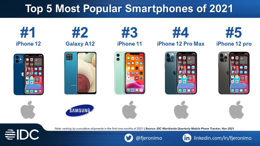 Als meistverkauftes Smartphone erwies sich das iPhone 12, das iPhone 11 rundete die Top 3 ab. Die Top 5 sind das iPhone 12 Pro Max und das iPhone 12 Pro. Außerdem wurde die Pro-Version häufiger gekauft als die reguläre Pro-Version. Leider hat die Analyseagentur IDC noch keine Zahlen in Stücken genannt. Sie waren wahrscheinlich für zukünftige Berichterstattung reserviert.