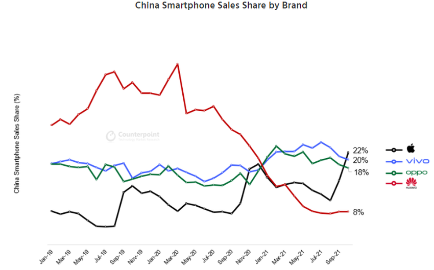 Das berichtet die Analyseagentur Counterpoint Research. Nach Angaben des Unternehmens besetzte Apple im Oktober dieses Jahres 22% des chinesischen Smartphone-Marktes und steigerte den Umsatz im Vergleich zum Oktober 2020 um fast das Eineinhalbfache (+ 46%).