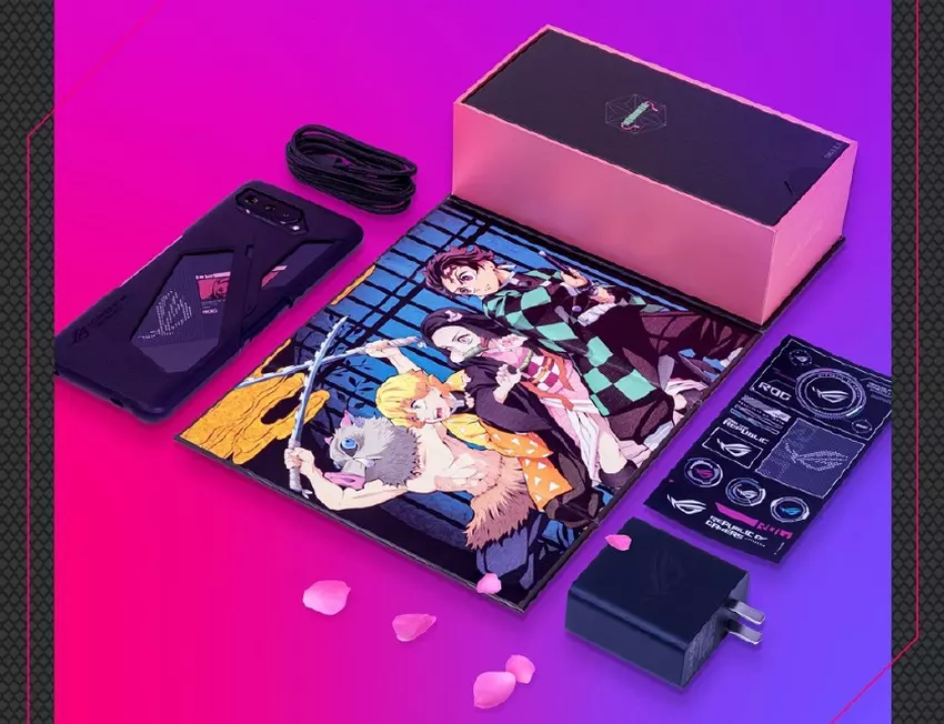 Das Smartphone ist schwarz lackiert und auf der Rückseite ist neben dem RGB-Logo der ROG-Serie ein Bild eines der Anime-Charaktere aufgetaucht. Neben einem Smartphone enthält die Box ein Poster mit vier Demon Slayer-Charakteren, ein Netzteil, eine Schutzhülle und ein Sync-Kabel.