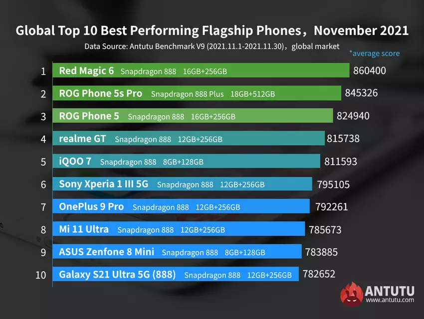 Zu den Top Ten gehören auch OnePlus 9 Pro, Xiaomi Mi 11 Ultra, ASUS ZenFone 8 mini (vermutlich ein normales ZenFone 8) und Samsung Galaxy S21 Ultra. Es wird erwartet, dass es bis Ende Dezember einen neuen Marktführer geben wird - Moto Edge X30 auf Snapdragon 8 Gen1.