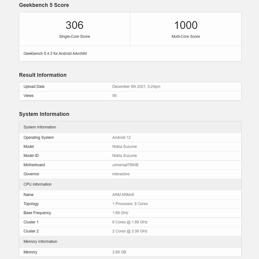 Nokia Suzume mit Samsung-Prozessor und Android 12 im Geekbench 5 . getestet
