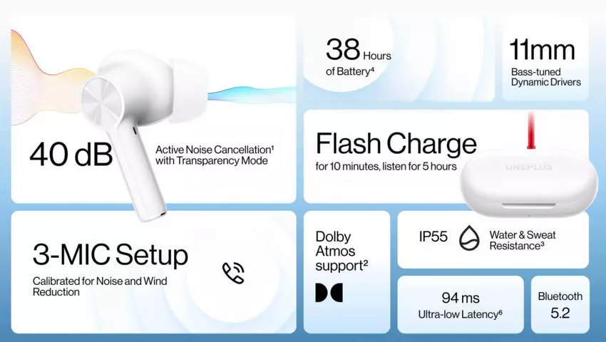 Der Kopfhörer ist mit dynamischen 11-mm-Treibern und drei Mikrofonen ausgestattet, die den Geräuschpegel um bis zu 40 dB reduzieren. Auch der Spritzwasserschutz der Klasse IPX4 und IP57, die Funktion der Schnellsynchronisation mit OnePlus-Smartphones und die Verbindung über Bluetooth 5.2 sind uns wichtig.