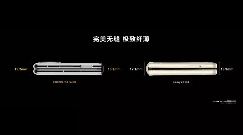 Der biometrische Sensor ist im Power-Key integriert. Im Huawei P50 Pocket gibt es keine Stereolautsprecher. Aber es gibt Wi-Fi 6, Bluetooth 5.2 und NFC. Gefaltete Abmessungen waren 87,3 x 75,5 x 15,2 mm und entfaltet - 170 x 75,5 x 7,2 mm. Die Neuheit wiegt in beiden Fällen 190 g.