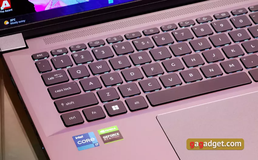 Das Notebook lässt sich bis zu einem Winkel von etwa 135° aufklappen. Die Scharniere sind komfortabel: Der Deckel rastet gut ein, und der Bildschirm wackelt kaum, wenn man ihn versehentlich anstößt. Die Tastatur des Acer Swift X 14 ist ganz normal für die ultraportablen Laptops des Unternehmens: volle Größe, ohne einen zusätzlichen Nummernblock. Es wird also nicht lange dauern, sich daran zu gewöhnen. Die obere Reihe der Funktionstasten ist kleiner. Lautstärke, Helligkeit, Tastaturbeleuchtung und andere Zusatzfunktionen werden über Fn und die F-Reihe aktiviert. Die Reihe endet mit der Power-Taste mit integriertem Fingerabdruckscanner. Home, Ende, PgUp und PgDn werden mit Pfeilen über Fn dupliziert. Der Navigationsblock ist nicht separat, aber die linken und rechten Pfeile sind in voller Größe. Sowohl Shift als auch Enter sind lang, Enter ist einstufig.