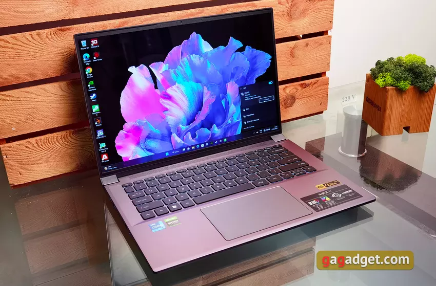 Trotz der kompakten Abmessungen und des geringen Gewichts steckt im Acer Swift X 14 ein Intel Raptor Lake Prozessor der 13. Generation aus der leistungsstarken H-Serie. In der getesteten Konfiguration handelt es sich um einen Intel Core i7-13700H. Der Prozessor wird im Intel 7 Prozess gefertigt, hat eine TDP von 45 W und einen Cache von 24 MB. Die Konfiguration der Kerne umfasst 6 produktive Kerne mit einer Frequenz von 2,4-5 GHz und 8 energieeffiziente Kerne mit einer Frequenz von 1,8-3,7 GHz. Es gibt Unterstützung für Multi-Thread-Computing: bis zu 20 Threads. Der eingebaute Intel Iris Xe verfügt über 96 Exekutiveinheiten, die maximale Frequenz kann 1500 MHz erreichen. Und die diskrete Grafik ist NVIDIA GeForce RTX 4050 Laptop mit TGP bis zu 50W in diesem Fall. Sie hat 2.560 CUDA-Kerne, 80 Texturierungseinheiten und 32 Rasterisierungseinheiten. Es gibt 80 Tensor-Kerne der 4. Generation zur Beschleunigung von Machine-Learning-Anwendungen. Es gibt 20 RT-Kerne der 3. Generation für Raytracing. In der Basisversion arbeitet die GPU mit einer Frequenz von 1455 MHz, die auf 1755 MHz erhöht werden kann. Der Videospeicher ist 6 GB GDDR6 groß. Diese Grafikkarte ist nicht die beste Option für Spiele, aber sie reicht in den meisten Fällen für die Arbeit mit Grafiken und Videos aus. Das ist genau das, wofür das Notebook ausgelegt ist, was durch die auf dem Notebook installierten NVIDIA Studio-Treiber bestätigt wird. Der Arbeitsspeicher ist 16 GB LPDDR5-4800 undistauf der Hauptplatine festgeschweißt, so dass es keine Aufrüstungsmöglichkeit gibt. Der Funkadapter ist das Spitzenmodell Killer Wireless Wi-Fi 6E 1675i, das normalerweise in teuren Gaming-Modellen zu finden ist. Er unterstützt die Standards 802.11 a/b/g/n/ac/ax, die 2X2 MU-MIMO-Technologie und verfügt über Bluetooth 5.2.