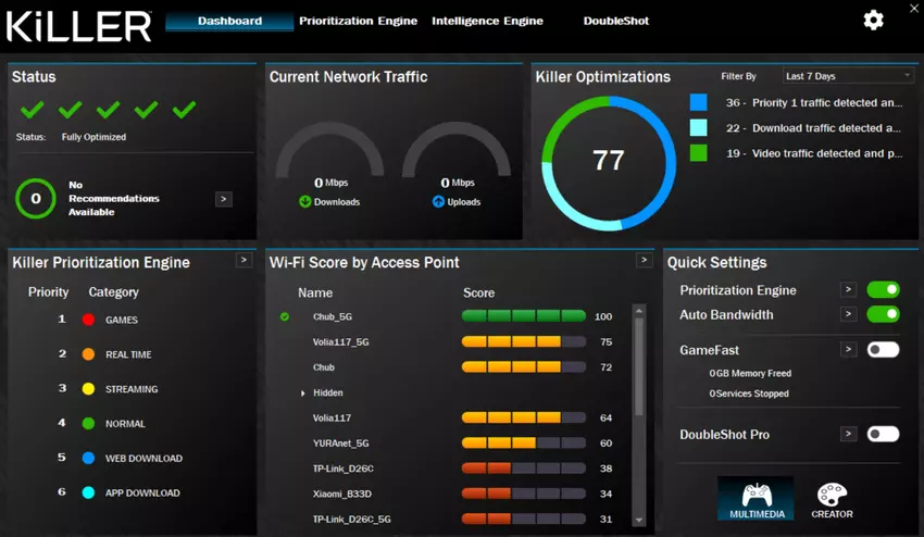 Mit dem Killer Intelligence Centre können Sie die WLAN-Leistung optimieren, die drahtlose Signalstärke überwachen und verschiedenen Anwendungen Prioritäten zuweisen.