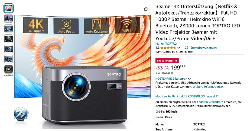 Der TOPTRO X7 4K Beamer ist momentan für 199,88 € erhältlich, reduziert von 298,99 € - das sind satte 33% Rabatt! Sie sparen ganze 99,11 € bei diesem Angebot, das Heimkino-Enthusiasten nicht verpassen sollten.