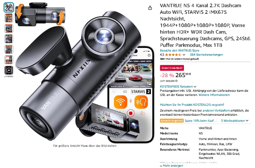 Die hochmoderne VANTRUE N5 360° Dashcam ist momentan für 265,99 € verfügbar, reduziert von 369,99 € - eine beachtliche Ersparnis von 28%! Ein Angebot, das Ihre Fahrsicherheit auf ein neues Level hebt.
