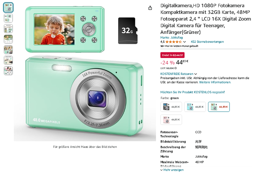 Die Jckkcfug Digitalkamera ist aktuell für nur 44,83 € erhältlich, reduziert vom ursprünglichen Preis von 58,99 €. Das entspricht einem großzügigen Rabatt von 24%! Mit einer Ersparnis von 14,16 € ist dieses Angebot ein wahrer Glücksgriff für alle, die ihre Erinnerungen in hoher Qualität festhalten möchten.