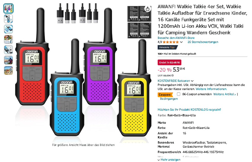 Das AWANFI Walkie Talkie 4er Set ist momentan für 53,59 € zu haben, heruntergesetzt von ursprünglich 66,99 €. Das bedeutet für Sie einen satten Rabatt von 20%! Mit einer Ersparnis von 13,40 € ist dieses Angebot ein echtes Schnäppchen für alle, die Wert auf klare Kommunikation legen.