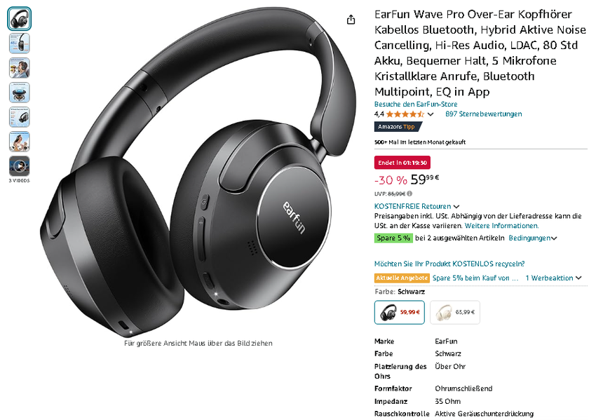 Die EarFun Wave Pro Kopfhörer sind derzeit für 59,99 € erhältlich, reduziert von 85,99 € - das entspricht einer Ersparnis von 30%! Ein Angebot, das Musikliebhaber begeistern wird.