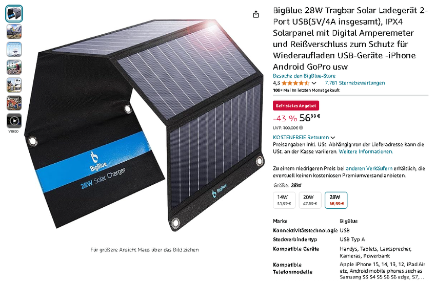 Das BigBlue 28W Tragbar Solar Ladegerät ist aktuell für 56,99 € verfügbar, reduziert von 100,00 € - das entspricht einer Ersparnis von 43%! Ein Angebot, das Outdoor-Enthusiasten begeistern wird.