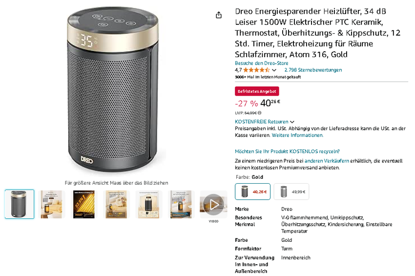 Der Dreo Heizlüfter ist aktuell für 40,26 € statt 54,99 € verfügbar - eine attraktive Ersparnis von 14,73 € (27%)!
