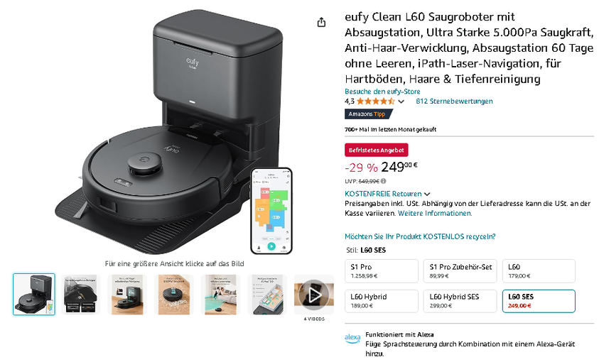 Der eufy Clean L60 ist momentan für 249,00 € statt 349,99 € verfügbar - eine beachtliche Ersparnis von 100,99 € (29%)!