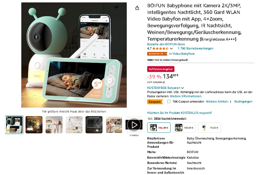 Das BOIFUN Babyphone ist jetzt für 134,88 € statt 219,99 € verfügbar - eine erhebliche Ersparnis von 85,11 € (39%)!