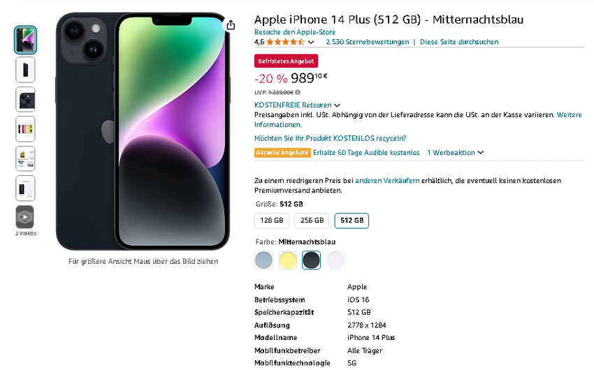 Das Apple iPhone 14 Plus (512 GB) ist momentan für 989,10 € statt 1.229,00 € erhältlich - das entspricht einer sensationellen Ersparnis von 20%!