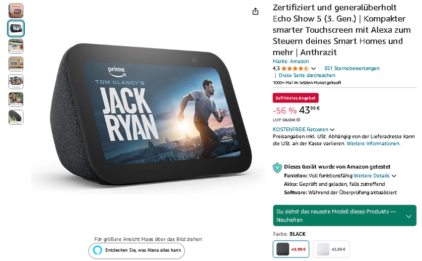 Der Echo Show 5 ist momentan für sensationelle 43,99 € statt 98,99 € erhältlich - eine unglaubliche Ersparnis von 56%!
