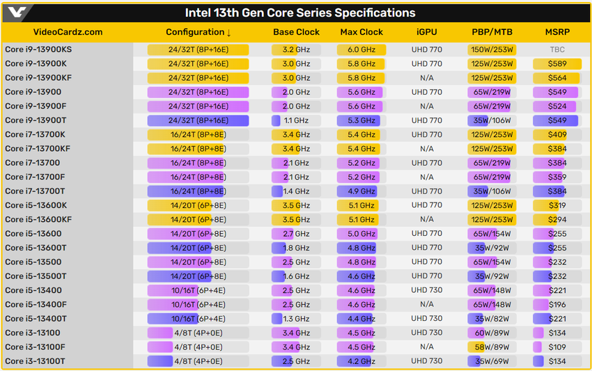 Im Jahr 2022 wurden K- und KF-Prozessoren mit bzw. ohne integrierte Grafik angekündigt. Beide Plattformen haben einen ungesperrten Multiplikator und eine TDP von 125 W. Ebenfalls im Jahr 2022 wird eine spezielle Version des KS (nur Core i9-13900) mit erweiterter Wärmeableitung (TDP = 150 W) vorgestellt.