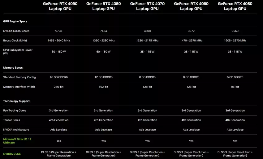 Zwischen den Neuerungen gibt es ein paar weitere gemeinsame Parameter. Insbesondere unterstützen sie alle Raytracing der dritten Generation, haben Tensorkerne der vierten Generation und verfügen über DLSS 3. Beachten Sie auch die Unterstützung für DirectX 12 Ultimate.