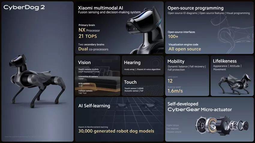 Der Roboter kann fortlaufend Rückwärtssaltos machen und im Falle eines Sturzes aus eigener Kraft auf den Füßen stehen. Die Laufgeschwindigkeit von CyberDog 2 liegt bei maximal 1,6 Metern pro Sekunde. Die Entwickler haben 19 Sensoren in das Gerät eingebaut, darunter LiDAR, und es mit einem Hör-, Seh- und Tastsinn ausgestattet.