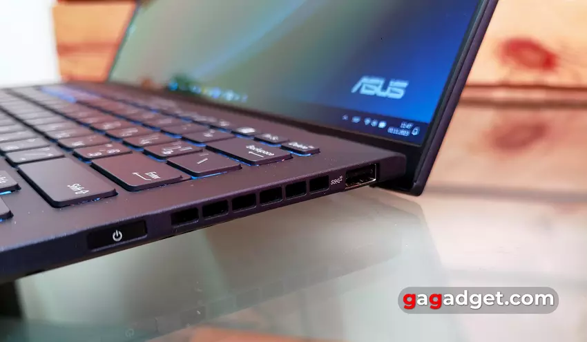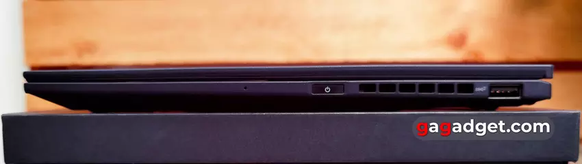 Auf der gegenüberliegenden Seite befinden sich Lüftungsöffnungen, ein USB 3.2 Gen 2 Typ-A-Anschluss in voller Größe, ein zusätzliches Mikrofon und ein Netzschalter, der auch als Fingerabdruckscanner dient. Das Layout ist nicht sehr praktisch, was bei Transformers-Laptops eher üblich ist. Es gibt aber auch eine Alternative für die Identifizierung des Besitzers in Form einer Infrarotkamera, die vielleicht bequemer ist. Die Ausstattung mit Anschlüssen ist für ein ultrakompaktes Modell sehr gut.
