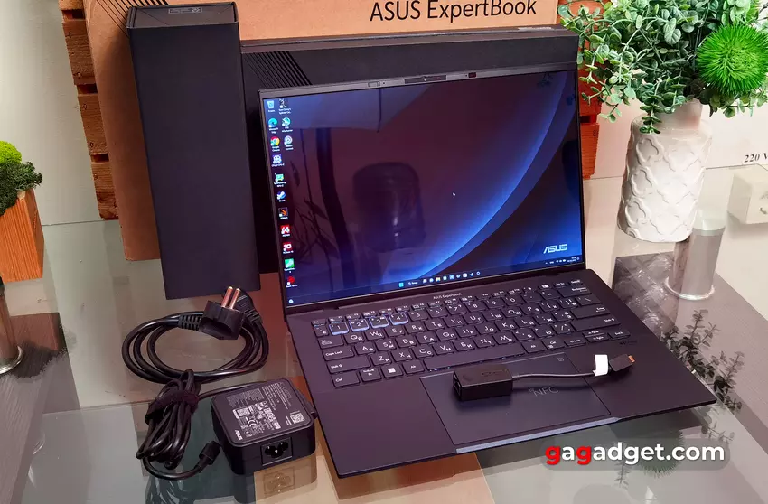 Das ASUS ExpertBook B9 OLED (B9403) ist nicht das erste Mitglied der ExpertBook-Reihe, das getestet wird. Sie haben sich schon immer durch ihre Akkulaufzeit ausgezeichnet. Das Notebook verfügt über einen dreizelligen 63-Wh-Akku. Im Alltagsbetrieb (Arbeiten mit Browser, Dokumenten und einfacher Fotobearbeitung) hält das Notebook bei einer Helligkeitsstufe von 50 % knapp über 9 Stunden durch. Es besteht also keine Notwendigkeit, das Netzteil mit ins Büro zu nehmen. Zum Aufladen wird ein 65-W-Netzteil mit einem USB-Typ-C-Anschluss verwendet. Eine volle Ladung dauert etwas mehr als zwei Stunden.