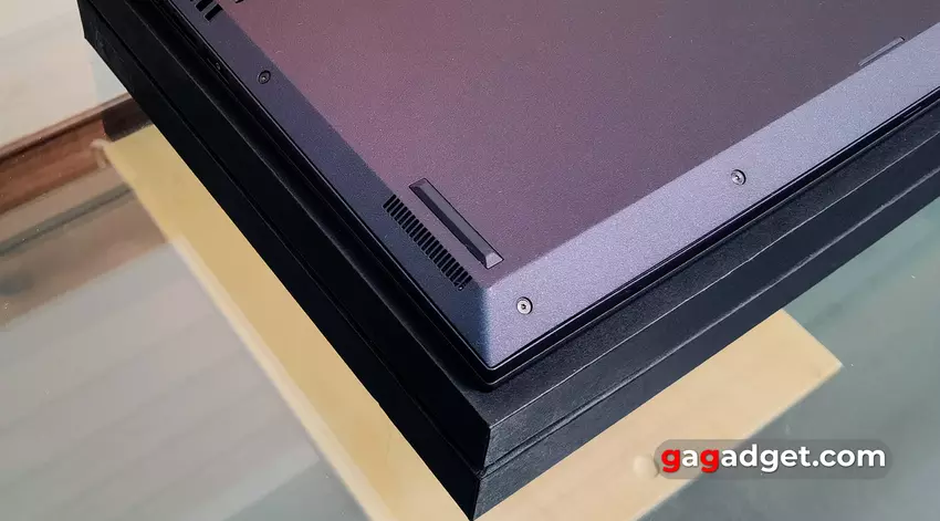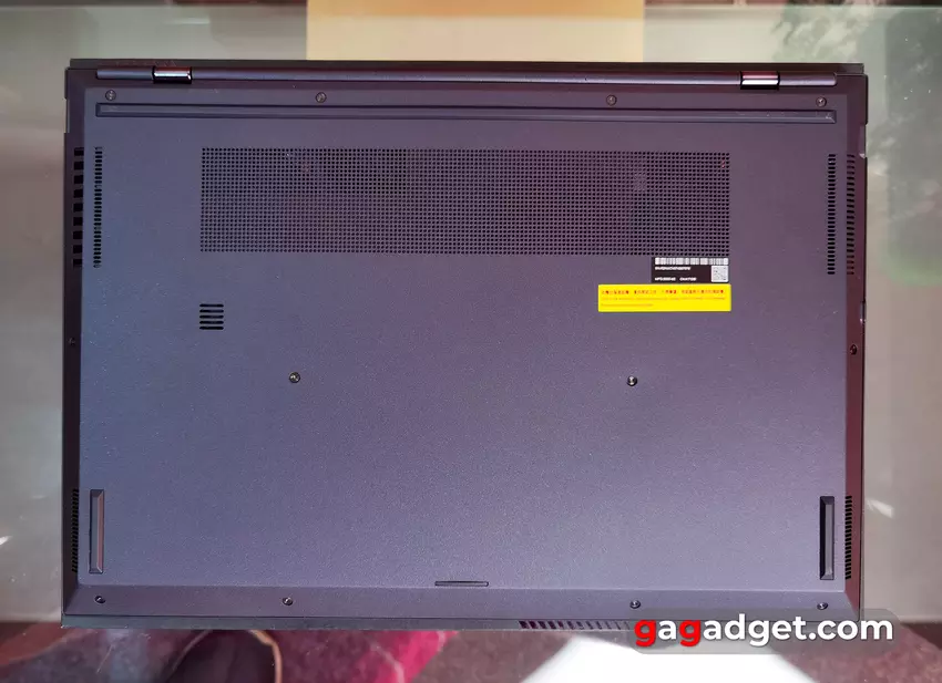 Die Unterseite des Laptops ist mit den üblichen breiten Gummifüßen und Lüftungsöffnungen ausgestattet. Nimmt man den Deckel ab, erhält man Zugriff auf das Laufwerk, das ausgetauscht werden kann. Es gibt keine weiteren Aufrüstungsmöglichkeiten, was typisch für moderne Ultrabooks ist.
