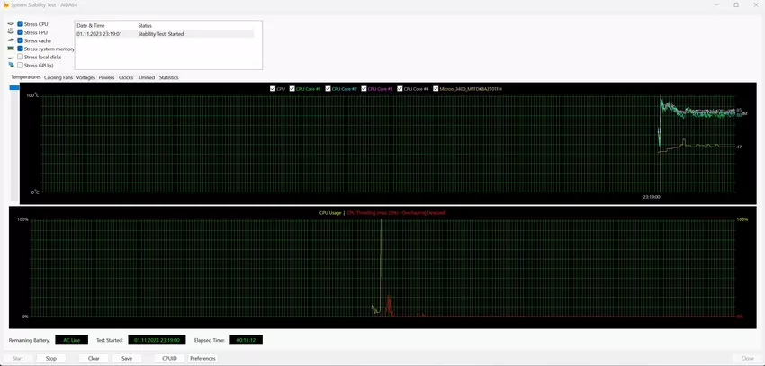 Das Kühlsystem umfasst zwei Low-Profile-Lüfter. Bei geringer Last ist das Kühlsystem völlig unhörbar. Nur bei maximaler Belastung ist ein leichtes Rauschen zu vernehmen. Die Tastatur bleibt kühl. Der Throttling-Test in AIDA64 zeigte, dass der Prozessor in der ersten Minute maximaler Last bis zu 95° heiß werden kann, was zu einem Leistungsabfall führt. Nach Anpassung des Kühlmittels sinkt die Temperatur auf 80-83° und bleibt auf diesem Niveau, der Laptop arbeitet stabil.