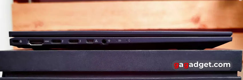 Das ASUS ExpertBook B9 OLED (B9403) verwendet verstärkte Anschlüsse. Es wird behauptet, dass der Typ-C 15.000 Verbindungen aushält, während alle anderen 5.000 aushalten. Auf der linken Seite des Laptops befinden sich ein Kensington Lock-Slot, zwei Thunderbolt 4-Anschlüsse mit Unterstützung für Power Delivery und Bildausgabe, HDMI 2.1, eine 3,5-mm-Audiobuchse, zwei LED-Anzeigen und ein weiterer Anschluss, der typisch für die ExpertBook-Serie ist. Dabei handelt es sich um einen Micro-HDMI-Anschluss (RJ-45 LAN) mit einer festen MAC-Adresse. Diese Lösung kann in einigen Unternehmensnetzwerken nützlich sein.