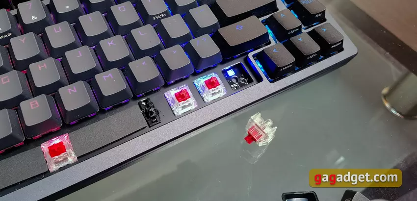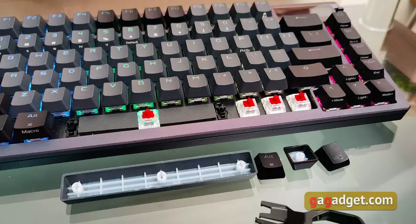 Die Stabilisatoren tun ihre Arbeit perfekt: alle langen Tasten wackeln nicht, wenn sie gedrückt werden. Und die Leertaste hat eine zusätzliche Dämpfung in Form einer weichen Isolierschicht.