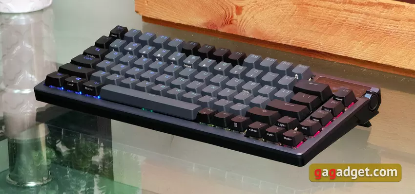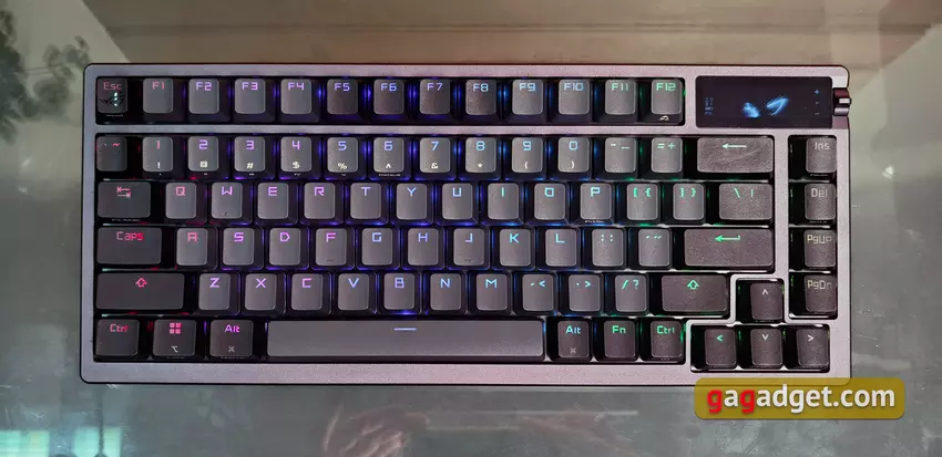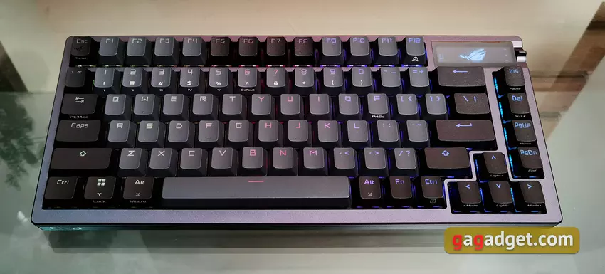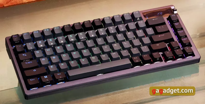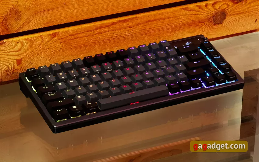 Die ASUS ROG Azoth ist sehr gut verarbeitet. Das Design ist stabil, es verbiegt oder verdreht sich nirgends. Die Abmessungen sind 326x136x40 mm und das Gewicht beträgt 1186 g. Und das ist ziemlich viel, wenn man bedenkt, dass es sich um ein kompaktes Modell handelt. Aber für eine mechanische Tastatur von hoher Qualität ist ein hohes Gewicht nur ein Plus. Vor allem, wenn man die Verwendung von Metall und mehreren Schichten von Dämpfern und Isolierung in der Konstruktion in Betracht zieht.