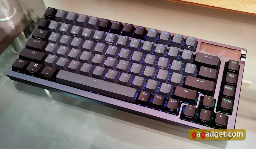 Eines der ersten Elemente, das ins Auge sticht, ist ein kleines 2-Zoll-OLED-Display in der oberen rechten Ecke der Tastatur. Es kann eine Vielzahl von nützlichen Informationen anzeigen. Wir werden Ihnen später mehr darüber erzählen. Daneben befinden sich ein Drei-Wege-Joystick und eine runde Taste an der Seite, um den Anzeigemodus zu wechseln.