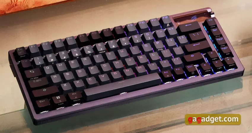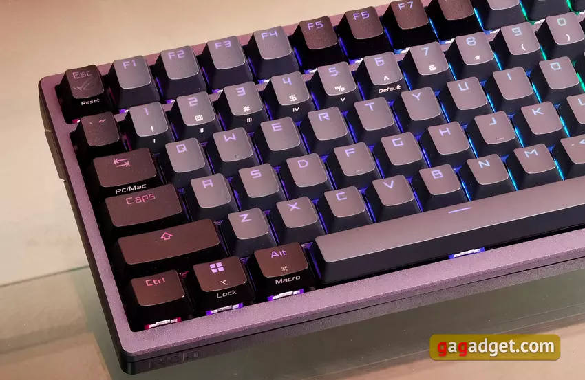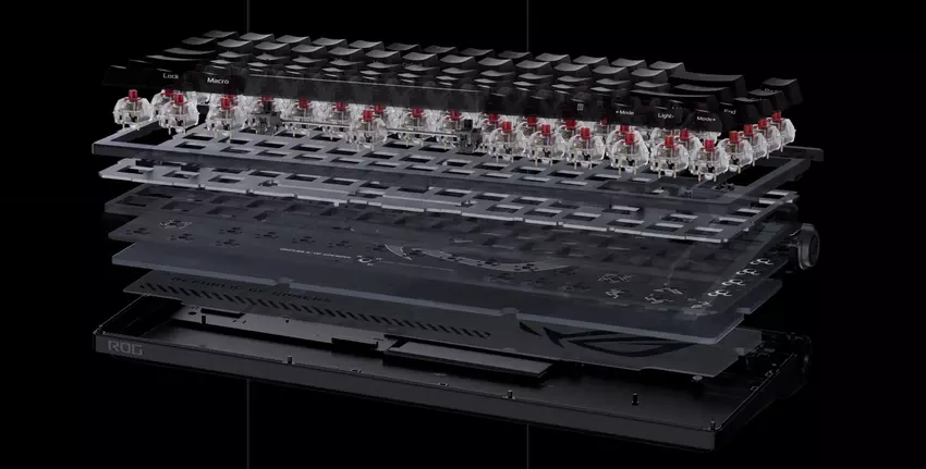 Die Tastatur verwendet ROG-Zweikomponenten-Kappen, die im Spritzgussverfahren hergestellt werden. Es wird haltbarer und rauer PBT-Kunststoff verwendet, der sich mit der Zeit nicht abnutzt. Trotz der Verwendung von PBT sind die Tastenkappen hintergrundbeleuchtet. Die Kappen sind von mittlerer Höhe und haben einen leicht verkürzten Kern. Dies soll verhindern, dass die Tasten bei der Benutzung mitschwingen.