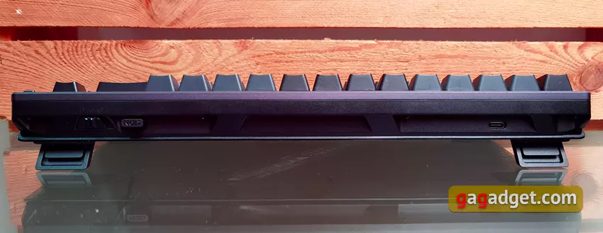 Auf der rechten Seite der hinteren Kante befindet sich ein Schalter für die Verbindungsmodi: kabelgebunden, 2,4 GHz und Bluetooth. Daneben befindet sich ein Fach für einen USB-Sender. Es ist mit einem Magneten ausgestattet, damit der Empfänger nicht verloren geht. Auf der rechten Seite befindet sich ein Typ-C-Anschluss zum Aufladen und für die kabelgebundene Verbindung.