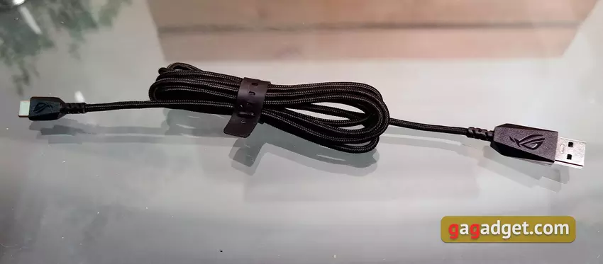 Das Type-C-Kabel ist 1,8 Meter lang und hat ein geflochtenes Kabel und Gummibänder. Im Allgemeinen ist bei einer Tastatur (insbesondere bei einer kabellosen) die Qualität des Ersatzkabels nicht das wichtigste Kriterium. Aber in diesem Fall ist alles in Ordnung: es ist leicht und flexibel,