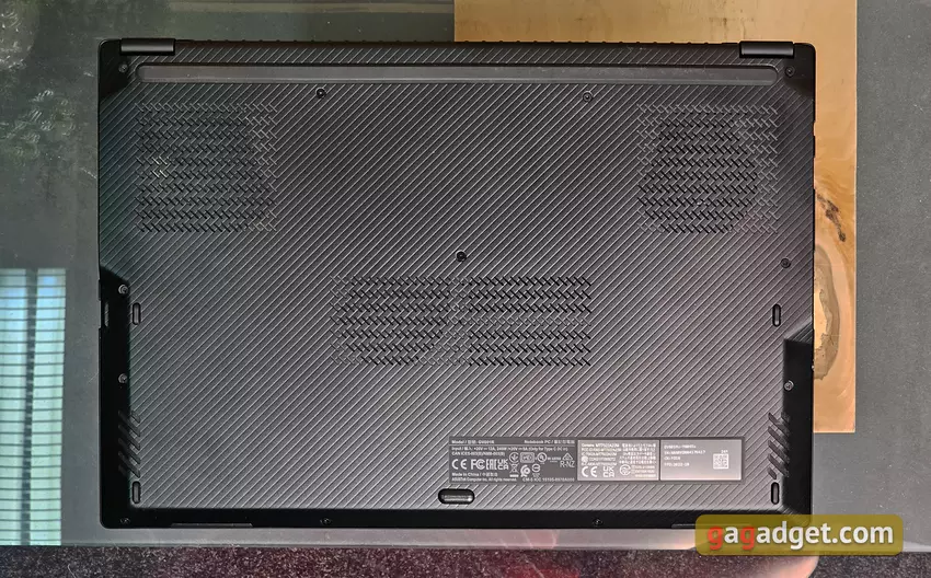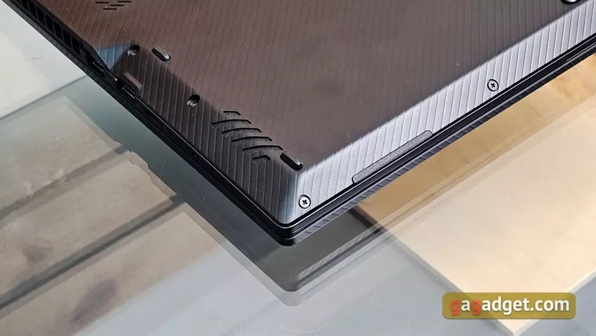 Die Unterseite des Laptops hat viele Lüftungslöcher und Gummifüße, um ein Verrutschen auf dem Tisch zu verhindern. An der Vorderseite befinden sich zwei weitere Lautsprecher. ASUS ROG Flow X16 hat eine Upgrade-Option, obwohl das Verfahren nicht sehr einfach sein wird. Um den Deckel zu entfernen, müssen Sie 13 Schrauben lösen. Es gibt zwei SO-DIMM-Steckplätze für RAM, bis zu 64 GB DDR5-4800 werden unterstützt. Es ist auch möglich, eine zusätzliche M.2-SSD zu installieren.