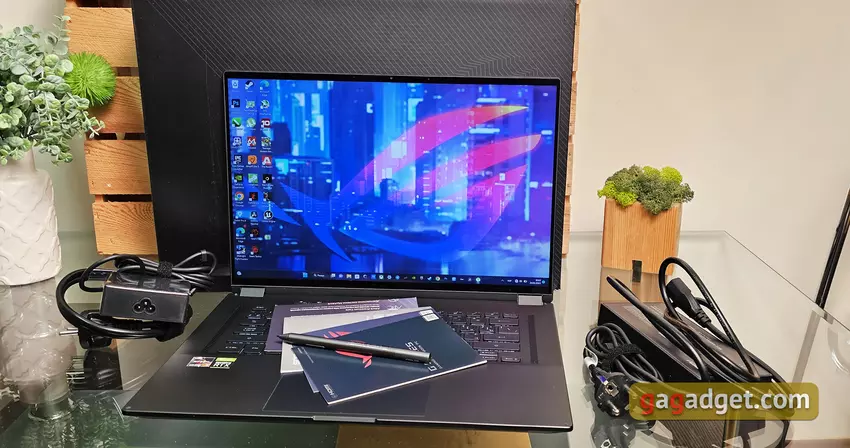 Der Gesamteindruck vom Aussehen und der Verarbeitungsqualität des ASUS ROG Flow X16 ist positiv. Alle Teile sind sehr gut eingepasst, und die Paneele lassen sich kaum verbiegen. Die Abmessungen des Notebooks betragen 355x243x19,4 mm und es wiegt 2,1 kg, was in Anbetracht des 16-Zoll-Displays und der sehr leistungsfähigen Komponenten sehr leicht ist. Sie können es problemlos in Ihrem Rucksack zur täglichen Arbeit mitnehmen. Außerdem kann man das zusätzliche 100-W-Netzteil im Büro lassen, wenn man nicht die maximale Leistung benötigt.