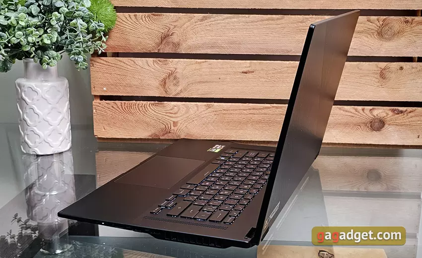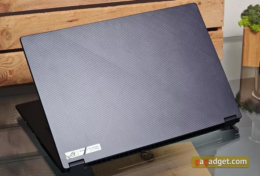 In Bezug auf Design und Aussehen ist das ASUS ROG Flow X16 dem Flow X13, das wir bereits getestet haben, sehr ähnlich. Das Gehäuse ist komplett schwarz und besteht hauptsächlich aus einer Magnesiumlegierung. Es gibt keine RGB-Lichter oder aggressive Gaming-Design-Elemente. Das Notebook sieht sehr ruhig aus. Und die geringen Abmessungen und das Gewicht könnten sogar den Eindruck erwecken, dass es sich nicht um ein Gaming-Modell, sondern um ein Ultrabook mit großem Bildschirm handelt. Es hat eine Textur auf dem äußeren Deckel mit diagonalen Streifen, die das Unternehmen als Gravitationswellen" bezeichnet, und ein ähnliches Muster auf dem unteren Deckel. In der unteren linken Ecke des Deckels befindet sich ein kleines Rechteck mit dem ROG-Logo. Die innere Handballenauflage hat ebenfalls eine schöne geprägte Textur, aber die Streifen sind viel dünner. An den Seiten der Tastatur befinden sich zwei Lautsprecher. Das gesamte Display ist durch Glas geschützt, was eine Standardlösung für Touchscreen-Notebooks ist. Unterhalb des Bildschirms befindet sich ein silberner ROG Flow Schriftzug, keine weiteren dekorativen Elemente. Das sieht alles sehr schick aus, aber Fingerabdrücke sind auf schwarzen Oberflächen ein wenig auffällig.