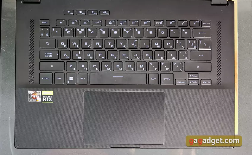 Die Laptop-Tastatur hat ein fast vertrautes Layout ohne zusätzlichen Nummernblock. Sie würde perfekt passen, wenn die Lautsprecher entfernt würden. Aber bei einem Gaming-Modell sehen zusätzliche Lautsprecher sinnvoller aus als ein Nummernblock. Eine Reihe von Funktionstasten sind kleiner, ebenso wie die Pfeile. Sowohl Shift als auch Enter sind lang, Enter ist einstufig. Die einzige Besonderheit sind die vier zusätzlichen Tasten oberhalb des Hauptblocks. Standardmäßig sind sie für die Lautstärkeregelung, die Stummschaltung des Mikrofons und den Start der proprietären Software Armoury Crate zuständig. Mit ihrer Hilfe können Sie Makros für diese Tasten konfigurieren.