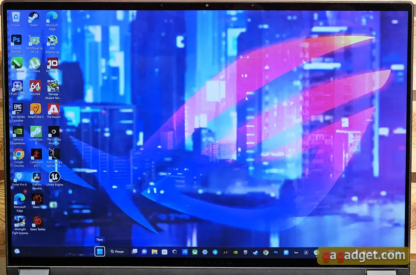 Das ASUS ROG Flow X16 wird von einem recht großen 4-Zellen-Akku mit 90 Wh angetrieben. Bei einer Wi-Fi-Verbindung und der Arbeit mit Dokumenten, Instant Messengern, einem Browser und Photoshop hielt das Notebook fast 7 Stunden durch, was für ein solches Notebook sehr gut ist. Natürlich war nur die integrierte Grafik aktiviert.