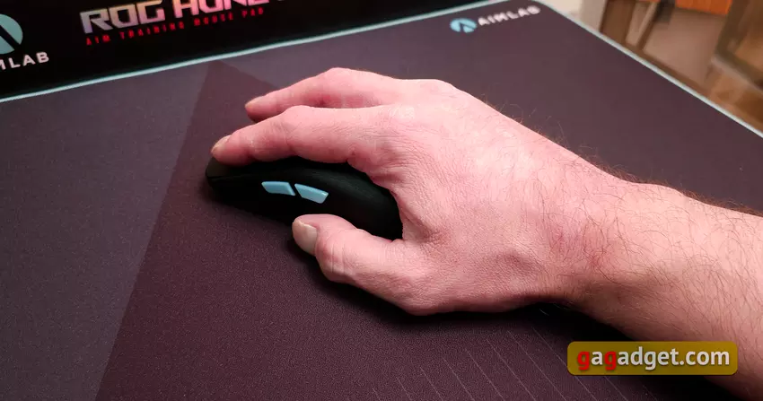 Die ASUS ROG Harpe Ace Aim Lab Edition ist eine symmetrische Maus, so dass Sie sie sowohl mit der rechten als auch mit der linken Hand verwenden können. Linkshänder haben jedoch keinen Zugriff auf zusätzliche Tasten. Die Gewichtsverteilung der Maus ist perfekt, sie neigt sich weder nach vorne noch nach hinten. Was die Form und das Gewicht angeht, so ist das eine Frage der individuellen Vorlieben. Diejenigen, die symmetrische, leichte Mäuse mögen, sollten sie auf jeden Fall ausprobieren. Dies ist wahrscheinlich die beste Umsetzung dieser Art von Maus. Aber nach den schwereren asymmetrischen Modellen ist es ziemlich schwierig, sich daran zu gewöhnen. In den ersten Tagen rutschte ich mit dem kleinen Finger über die Spielfläche, was nicht sehr komfortabel ist. ASUS behauptet, dass die Maus für jeden Griff geeignet ist. Es hängt alles von der Größe Ihrer Handfläche ab. Für mich, mit mittelgroßen Händen, war es optimal, die Maus mit einem Fingergriff zu benutzen. Für kleinere Hände ist ein Handflächengriff besser geeignet. Die raue Oberfläche und die geprägten Seiten erlauben es, die ASUS ROG Harpe Ace Aim Lab Edition sicher zu halten, sie rutscht nicht aus der Hand.