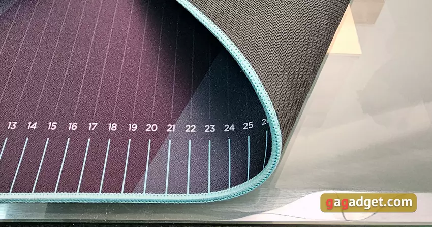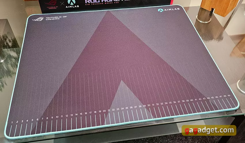 Wir haben die ASUS ROG Harpe Ace Aim Lab Edition mit der proprietären ROG Hone Ace Aim Lab Edition Gaming-Oberfläche verwendet. Sie hat eine Stoffoberfläche und recht große Abmessungen von 508x420 mm. Neben der Maus lag auch der ASUS ROG Zephyrus M16 (2023) Laptop sehr gut auf der Oberfläche. Die Oberfläche ist dunkelgrau mit hellen Nähten am Rand. Auf der Vorderseite befinden sich Messmarkierungen in Zentimetern für das Training der Genauigkeit im Aim Lab.
