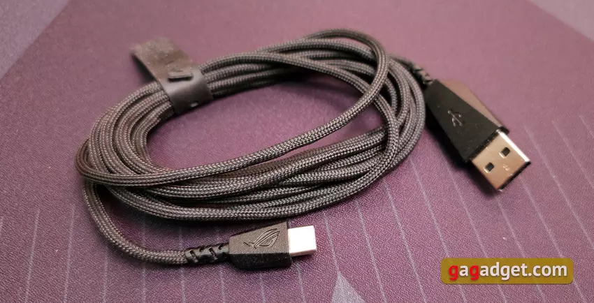 Das Kabel hat USB-Typ-A- und USB-Typ-C-Anschlüsse. Die Länge beträgt 2 Meter, und es wird ein sehr leichtes und flexibles ROG Paracord-Geflecht verwendet. ASUS verwendet solche Kabel schon seit langem in Gaming-Mäusen. Sie sind wirklich sehr bequem und leicht, aber nicht sehr langlebig. Das Geflecht ist vom eigentlichen Kabel getrennt, und es bilden sich von Zeit zu Zeit Falten. Für den Transport wird ein Gummiband mitgeliefert.