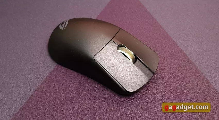 Die Haupttasten verwenden ASUS ROG Micro Switch-Schalter mit einer Lebensdauer von 70 Millionen Klicks. Sie haben einen sehr schönen, klaren und informativen Klick. Die Zusatztasten sind ebenfalls bequem und haben einen deutlichen Abstand. Aber das Rad ist nicht sehr gelungen. Wenn man langsam scrollt, arbeitet es leise, aber die Abtrennungen sind nicht sehr deutlich. Bei schnellem Scrollen sind die Abtrennungen zwar deutlich, aber der Kraftaufwand ist deutlich höher und das Rad beginnt zu rumpeln.
