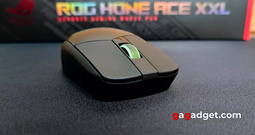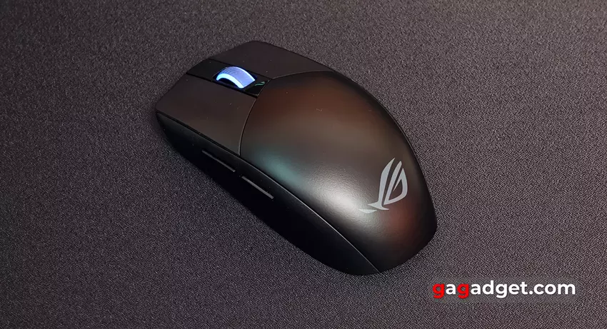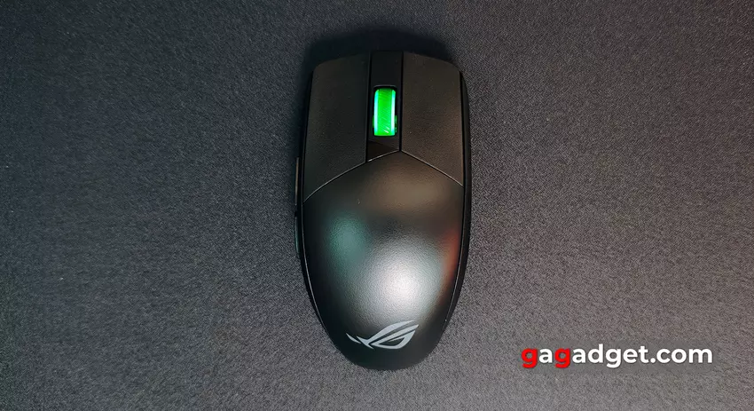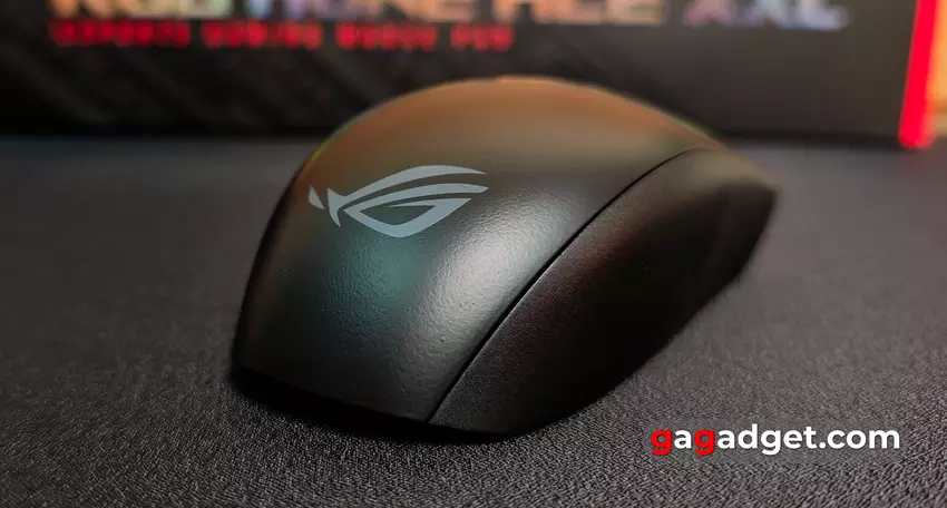 Trotz der symmetrischen Form befinden sich zusätzliche Tasten nur auf der linken Seite der Maus, so dass Sie sie nur mit der rechten Hand vollständig bedienen können. Die Tasten sind breit und haben einen deutlichen Abstand. Es gibt keine Gummiauflagen, sondern kleine diagonale Einkerbungen in der Nähe der Vorderseite der Seiten für besseren Halt. Auf der rechten Seite befindet sich das ROG-Logo.