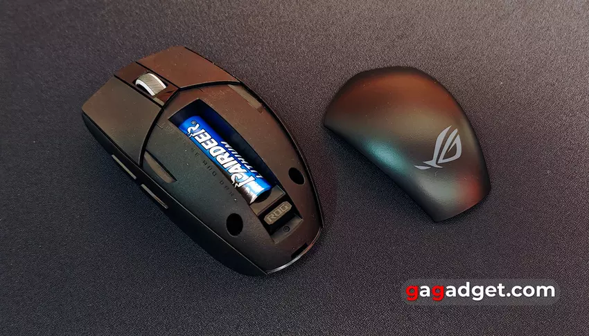 Die ASUS ROG Strix Impact III Wireless hat eine symmetrische Form und kann theoretisch sowohl mit der rechten als auch mit der linken Hand verwendet werden. Allerdings gibt es zusätzliche Tasten nur auf der linken Seite, so dass man es nur mit der rechten Hand vollständig bedienen kann. Das ist ganz typisch für solche Modelle. Die Maus ist klein, und ASUS behauptet, dass sie optimal für das Greifen mit den Fingern oder der Klaue geeignet ist. In der Tat ist ein Griff mit der Handfläche nur mit einer sehr kleinen Hand möglich. Dank ihres geringen Gewichts lässt sich die Maus sehr bequem mit den Fingern bedienen. Der Krallengriff ist für die anspruchsvollsten Benutzer gedacht. Trotz des Fehlens zusätzlicher Gummipads rutscht die Maus nicht aus der Handfläche. Die raue Oberfläche an den Seiten erfüllt ihre Aufgabe gut. Über die Gewichtsverteilung lässt sich nur schwer etwas sagen, da sie von der verwendeten Batterie abhängt: Der Platz für die Batterie ist leicht zur Rückseite der Maus verschoben. Bei Verwendung der mitgelieferten AA-Batterie ist die Gewichtsverteilung ganz normal, die Maus kippt nirgends, wenn sie von der Oberfläche kommt.