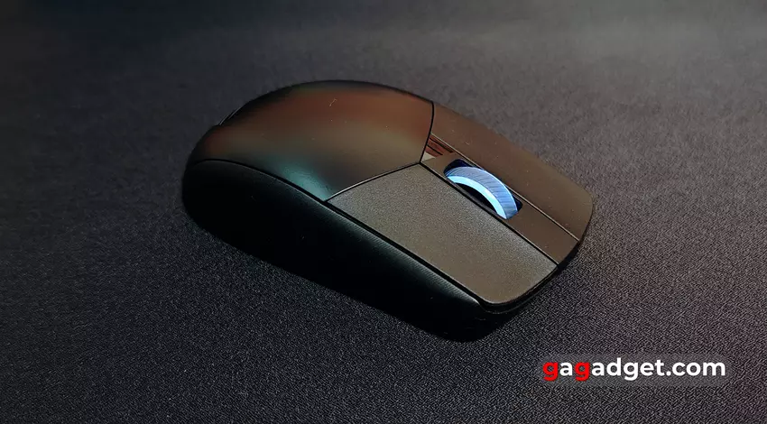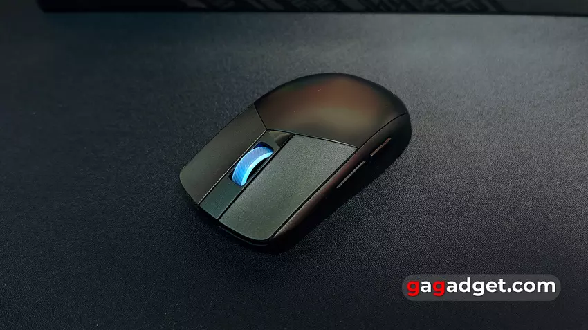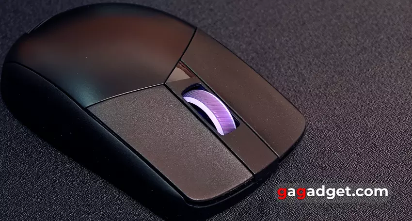 Das Scrollrad ist das einzige hintergrundbeleuchtete Element der Maus. Es ist durchsichtig, mit einer Gummibeschichtung und diagonalen Einkerbungen für bessere Griffigkeit.