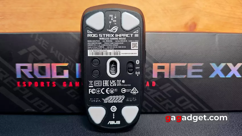 Darunter befinden sich vier dreieckige weiße Teflonfüße, ein optischer ROG AimPoint-Sensor mit einem dünnen Teflonrahmen, ein Schalter für den Verbindungsmodus und Tasten zum Umschalten von DPI und Verbindungsmodi. Sie werden auch für einige Anpassungen während der Fahrt verwendet.
