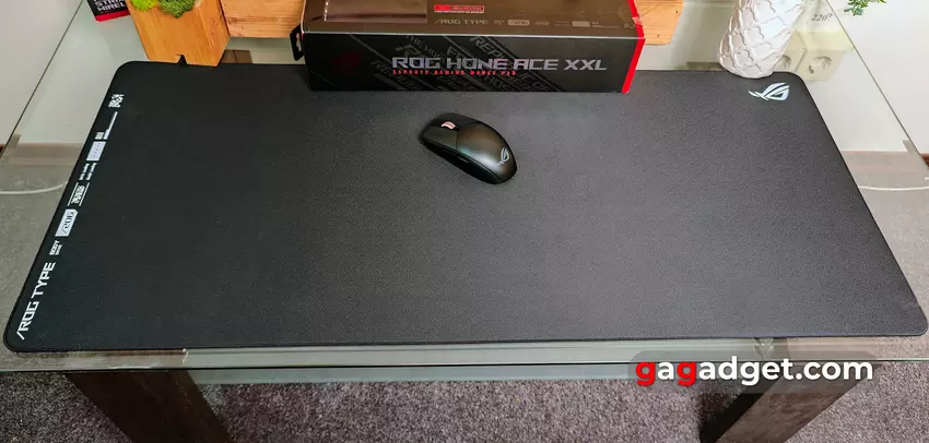 Zusammen mit dem ASUS ROG Strix Impact III Wireless haben wir uns die ASUS ROG Hone Ace XXL Gaming-Oberfläche angesehen. Dies ist die größte Oberfläche, die gg jemals gesehen hat und wahrscheinlich eine der größten im ASUS-Sortiment. Sie hat eine Größe von 900x400mm, so dass eine Maus, eine Tastatur und ein Monitor problemlos darauf Platz finden. Oder eine Maus mit einem Laptop. Die Oberfläche ist schwarz, mit einem Minimum an dekorativen Elementen: ein weißes ROG-Logo in der oberen rechten Ecke und Beschriftungen am linken Rand.
